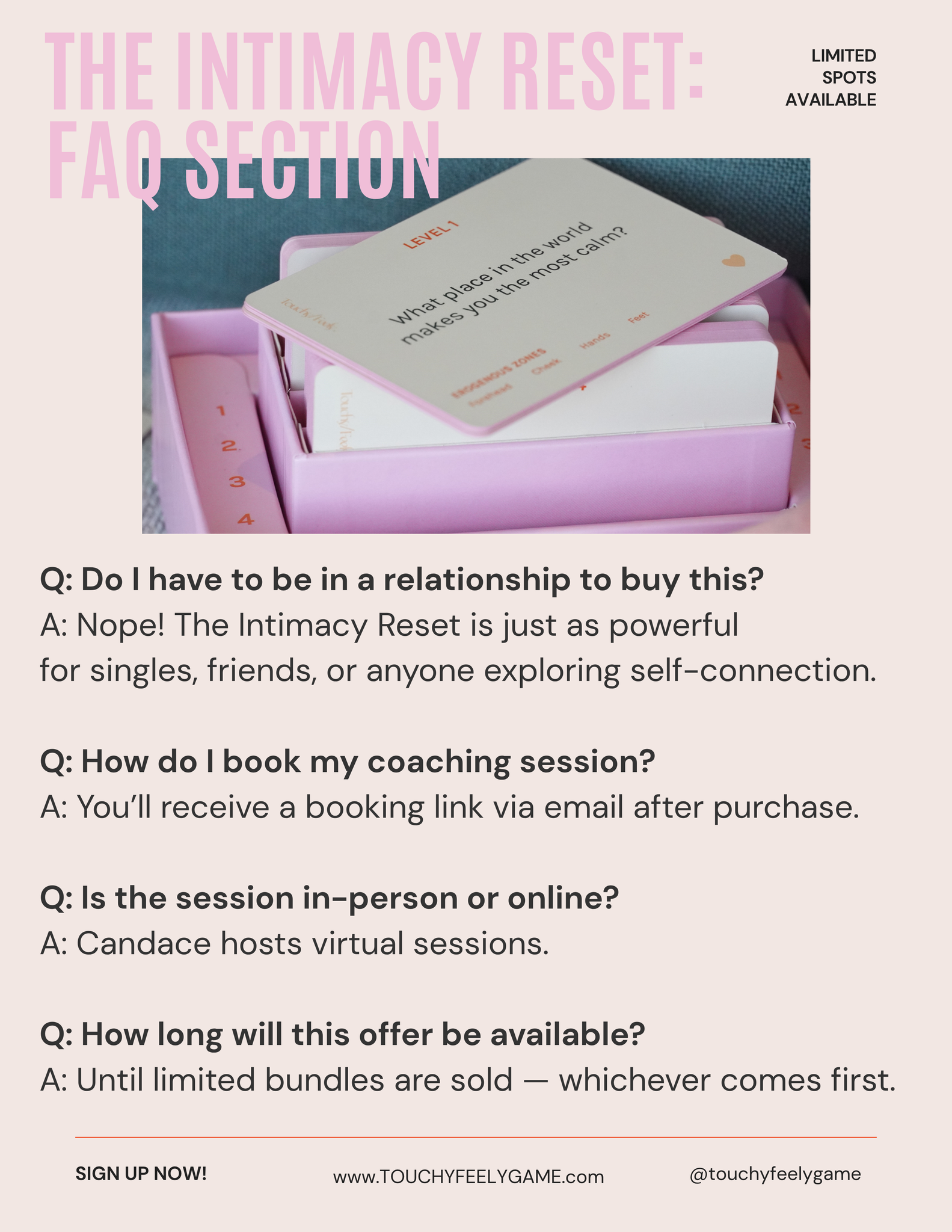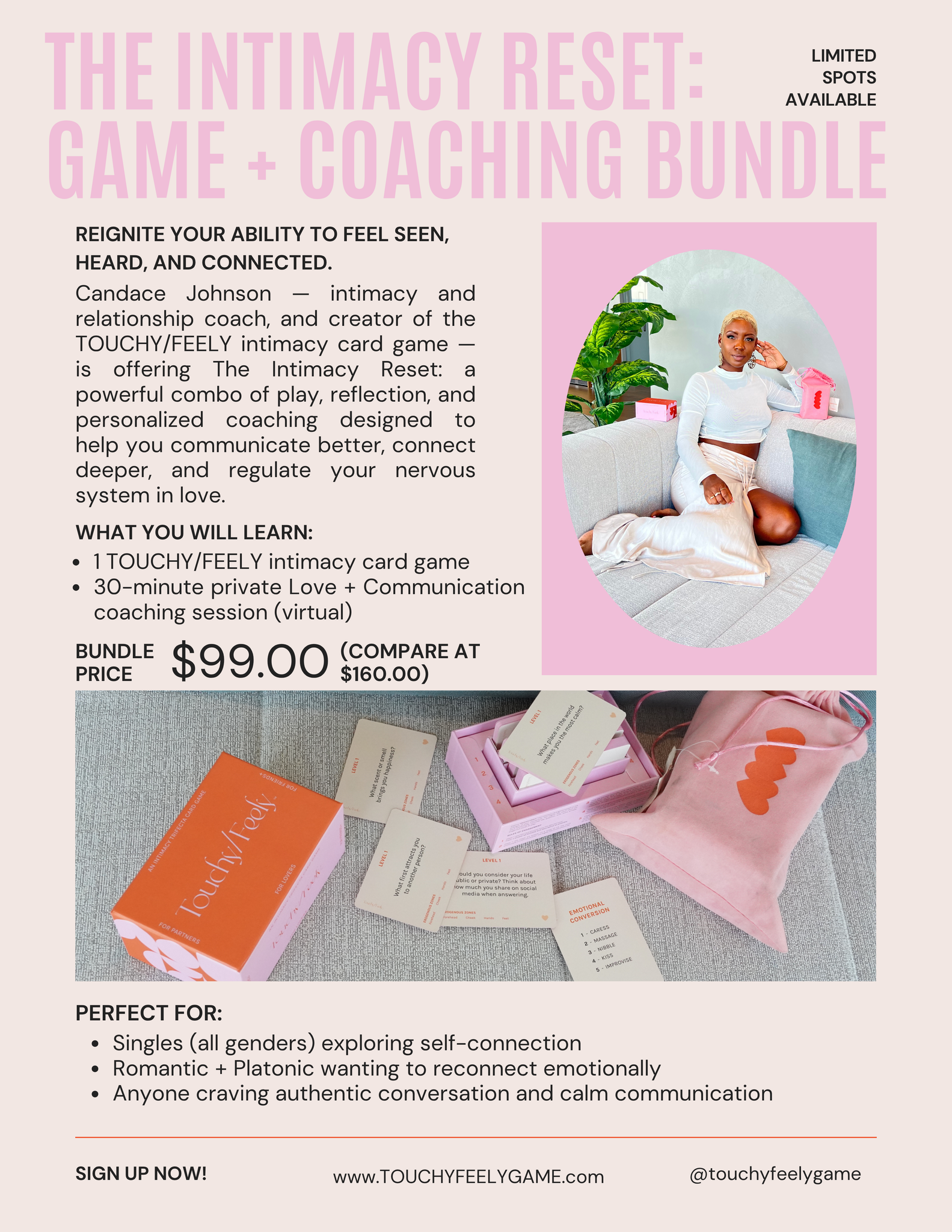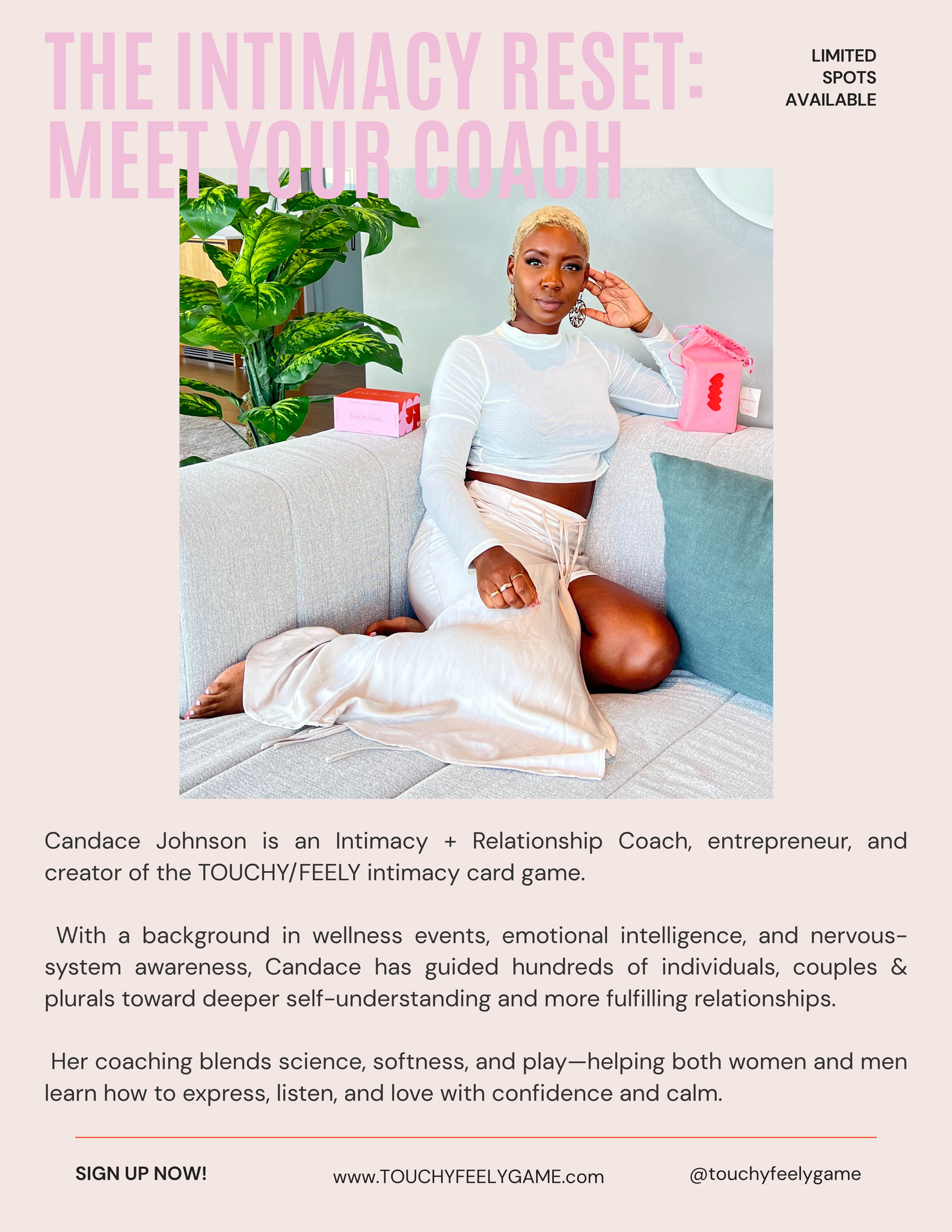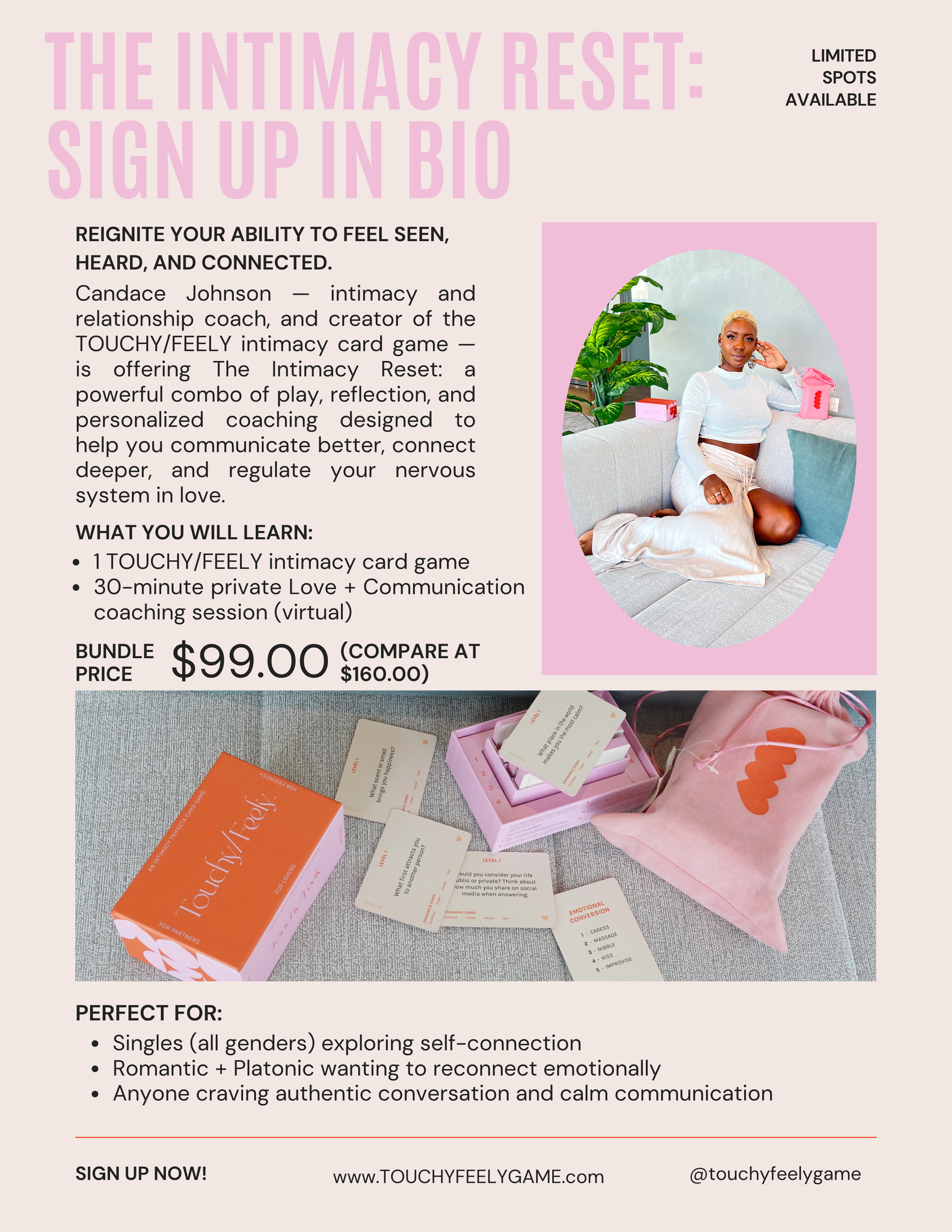Reignite your ability to feel seen, heard, and connected — with the TOUCHY/FEELY intimacy card game and a private 30-minute Love + Communication coaching session with Candace Johnson.