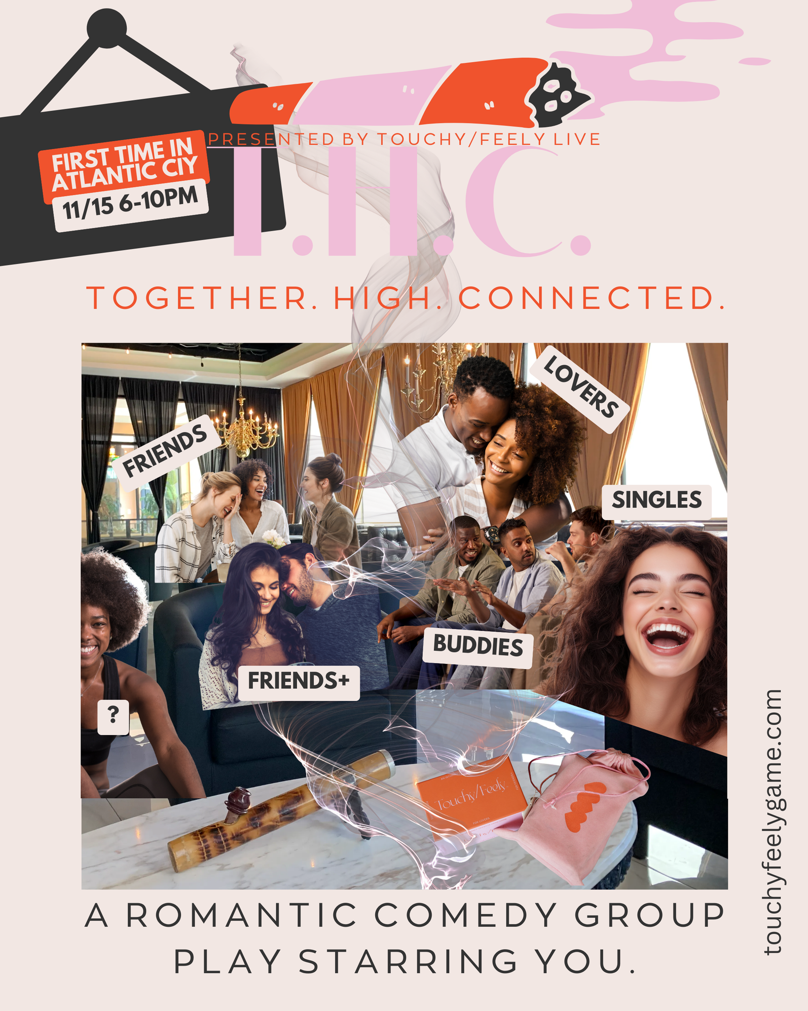- 7:00 – 8:30 PM → Smoke + share playfully with TOUCHY/FEELY intimacy card game, designed to bring strangers, friends, couples, and plurals into deeper connection.